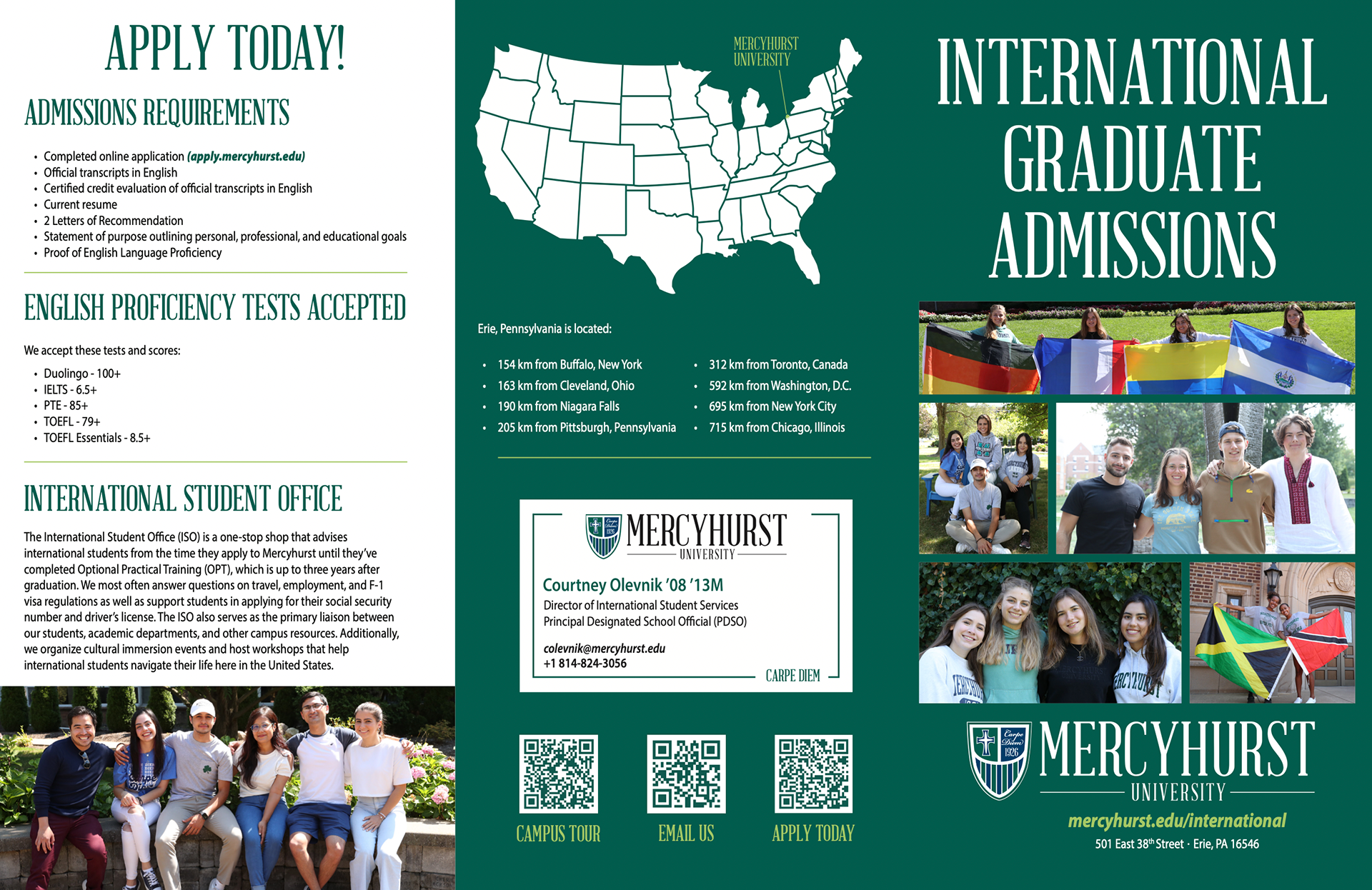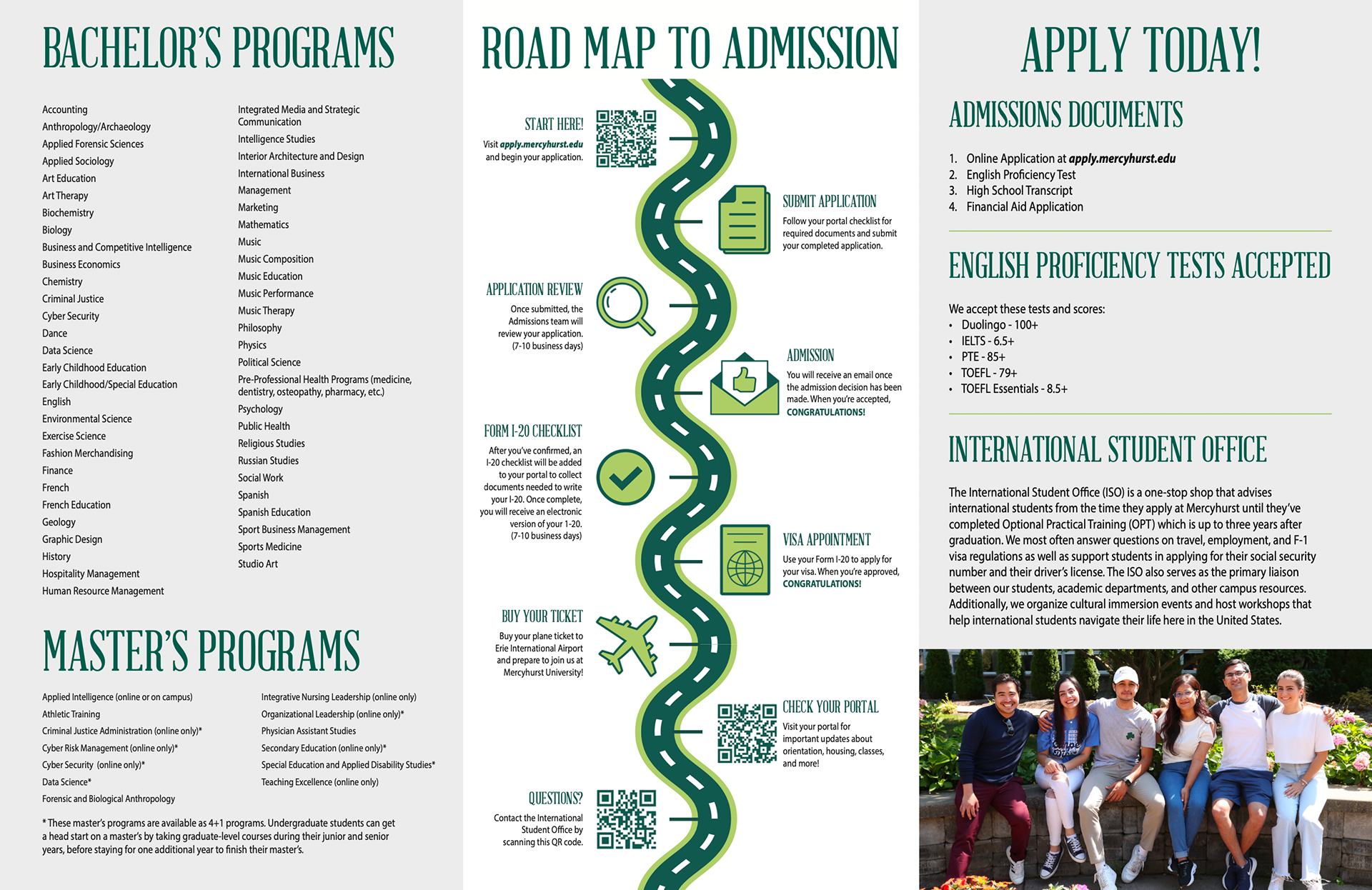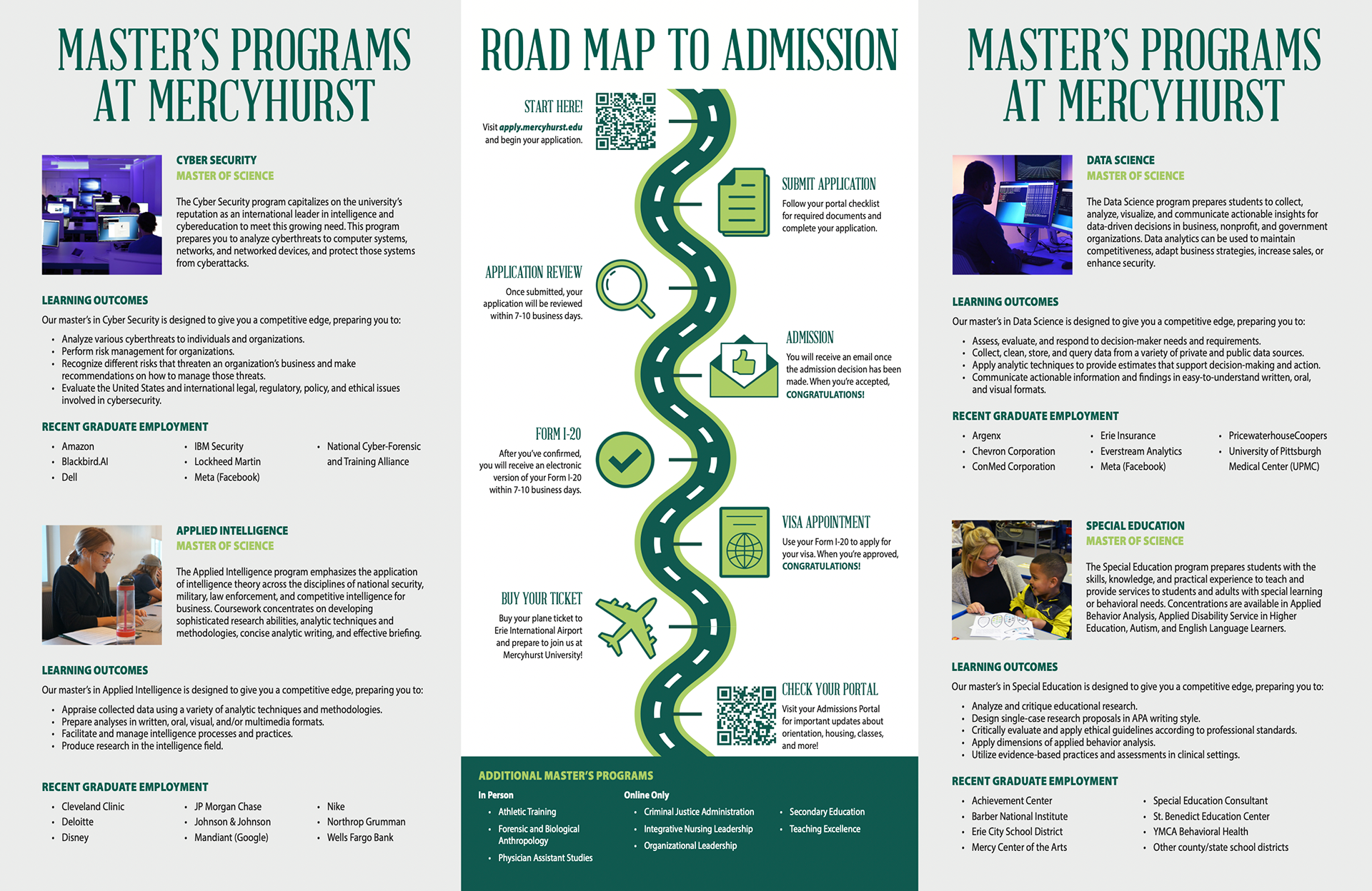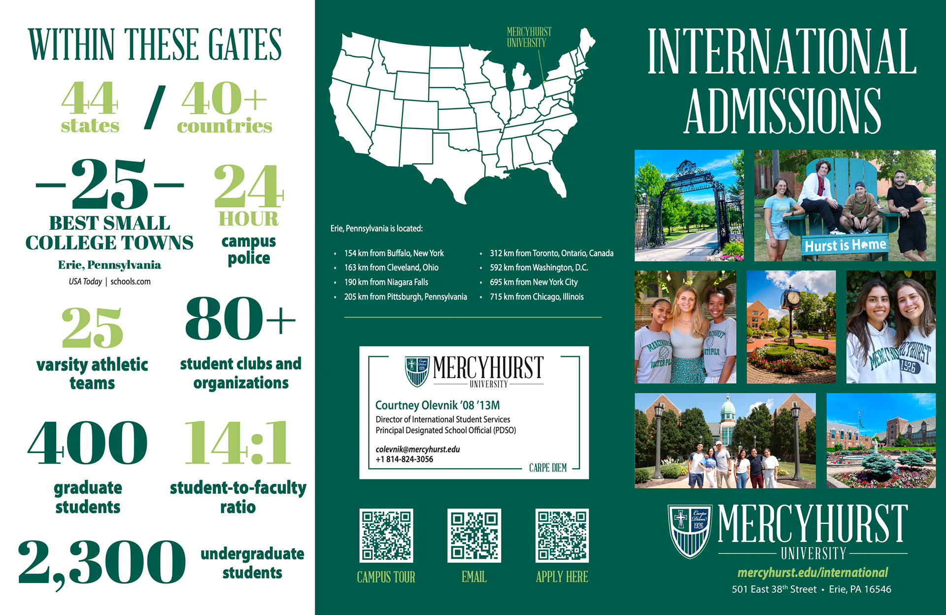 I created these trifold piecesĀ for Mercyhurst University's International Admissions office for the counselors to use while traveling.