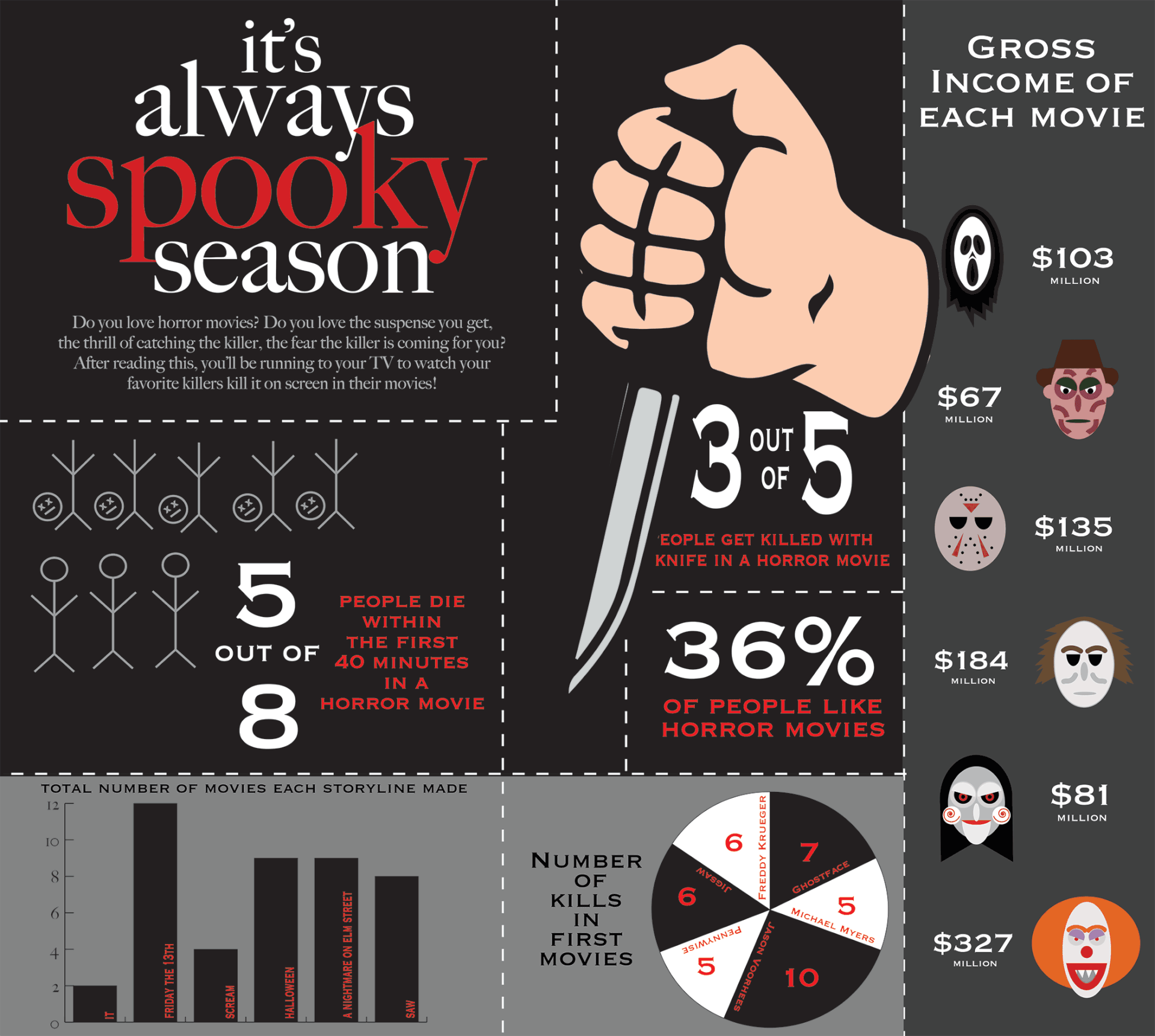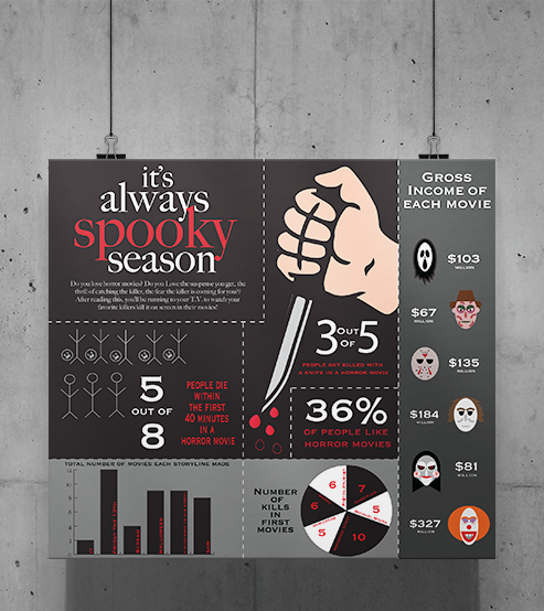 I created this motion graphic in my Motion Design class. We had to make an infographic poster and add a gif on top of it. I chose horror movies as my subject matter and had the hand with the knife move as my gif.