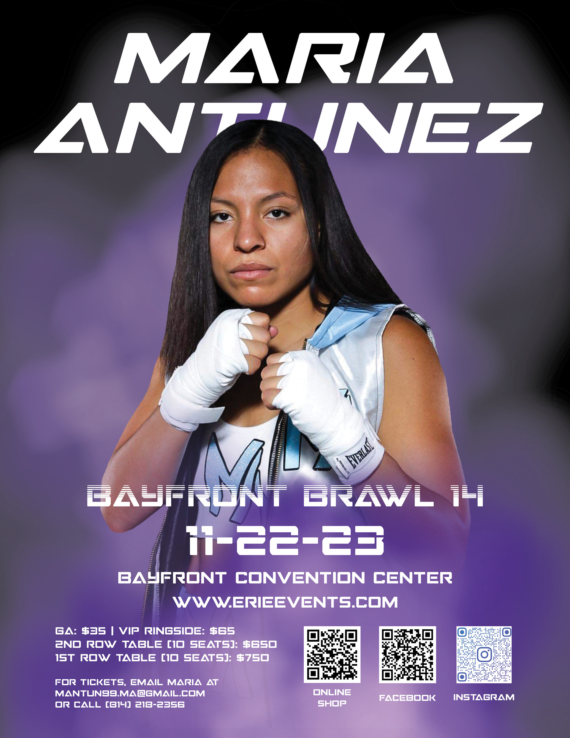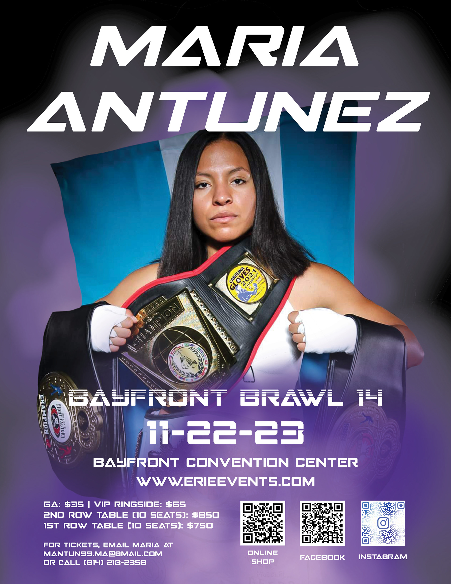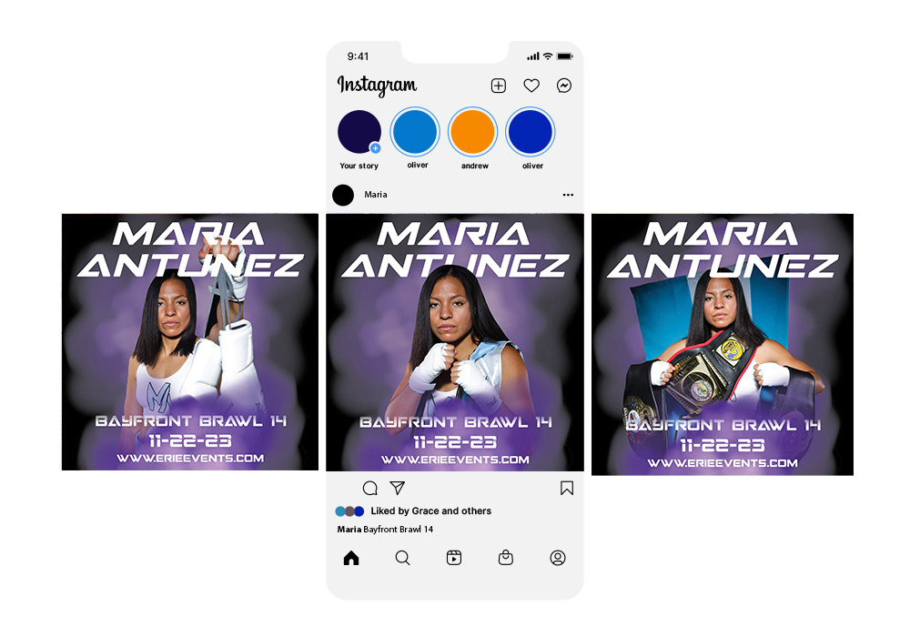 I worked with Maria Antunez Centeno on promoting her for the Bayfront Brawl 14 event. I provided her with Instagram grid graphics and story graphics, Facebook graphics, and posters in various sizes.