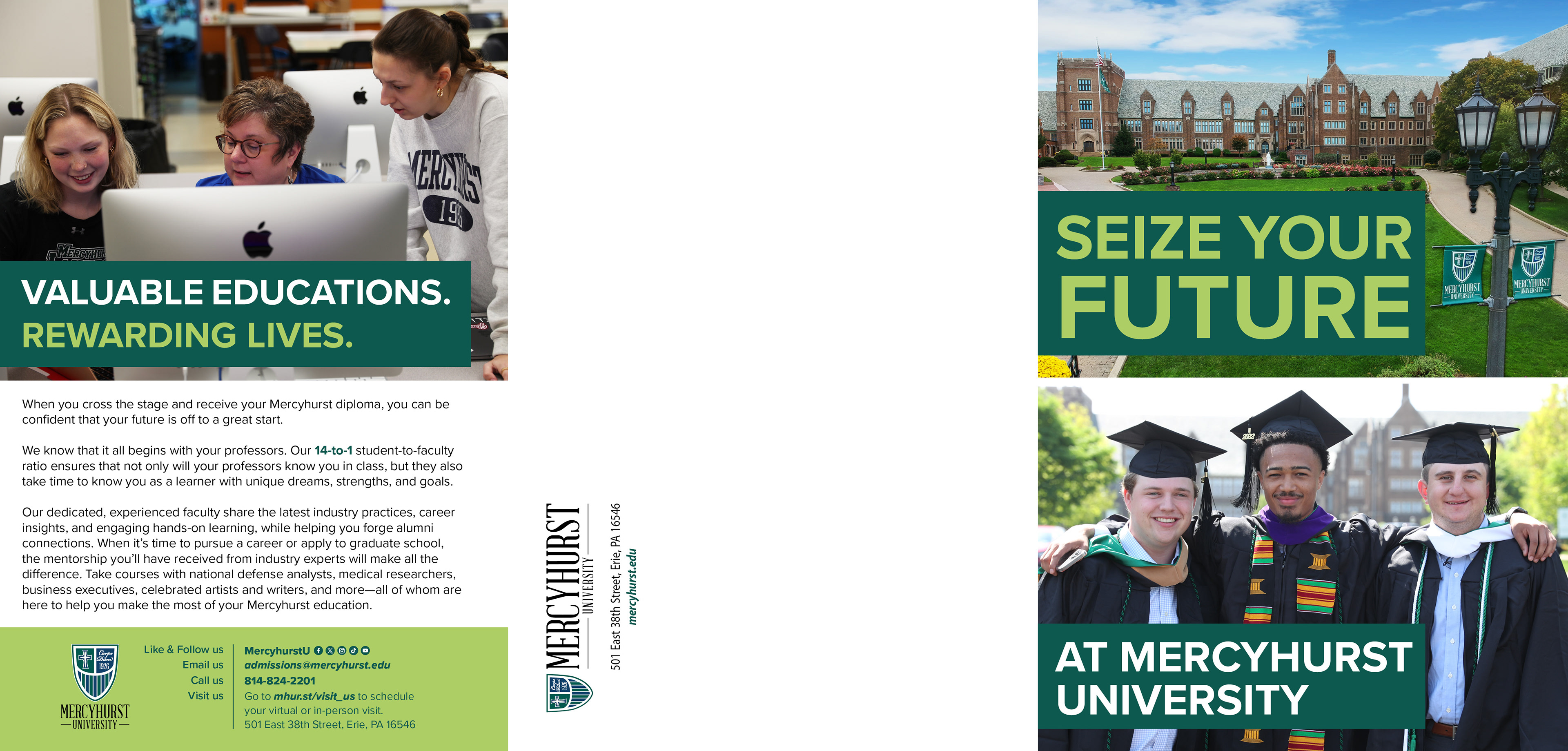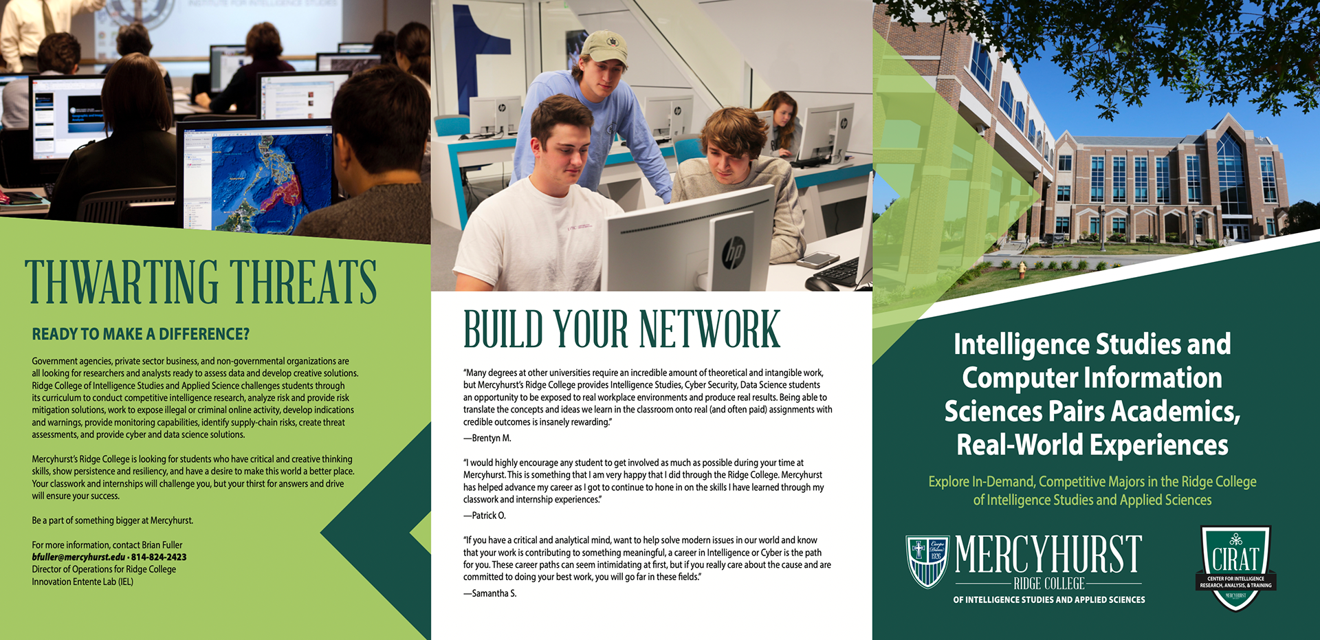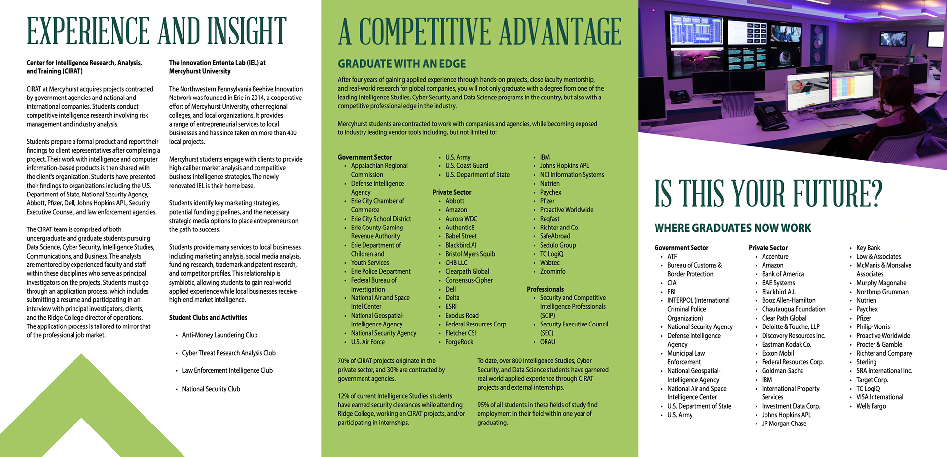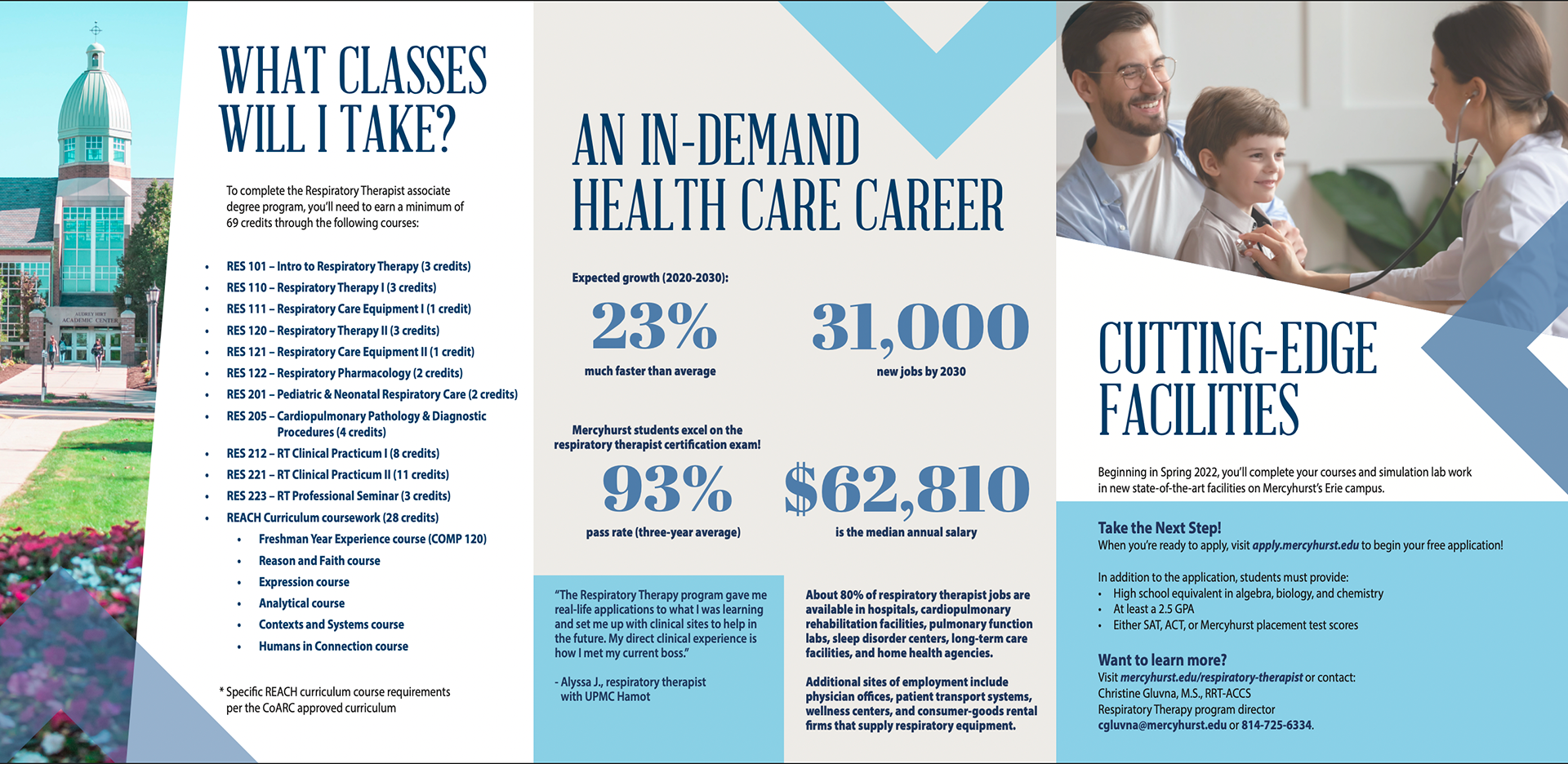 I have created many brochures for Mercyhurst University. I have included a brochure for the Intelligence Studies program, the Respiratory Therapy program, Financial Aid, and Outcomes.