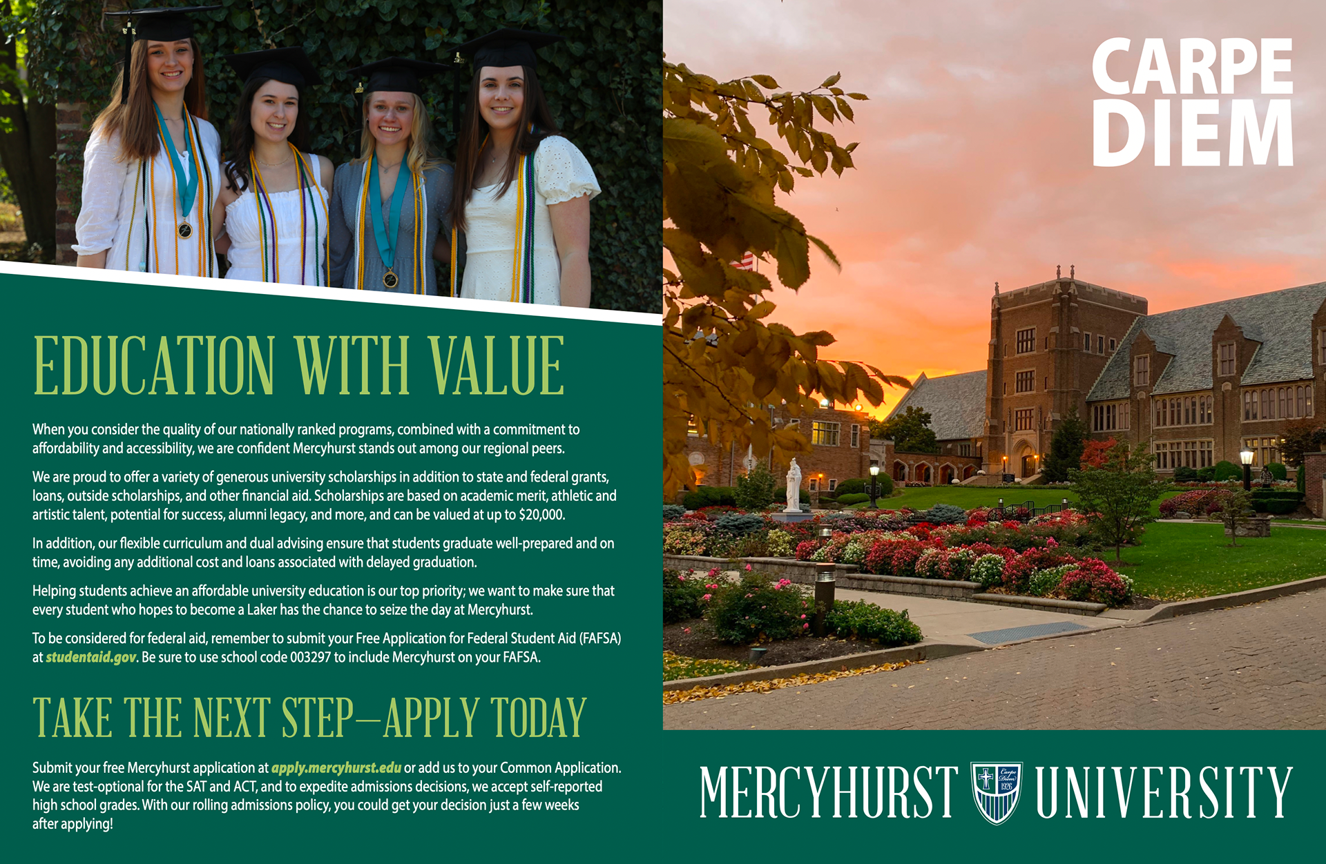 I created these different mailer pieces for Mercyhurst University's Fall Yield Cycle. The first is our fall travel piece which admission counselor's take when traveling to schools. The second is our fall events piece and the third is our fall events postcard which got mailed out to prospective students. The last piece is our touchpoint piece that gets mailed out to prospective students after they receive our viewbook.